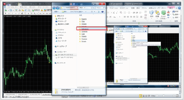"XM Trading MT4"のフォルダを開いた後、"MQL4"そして、"Indicators"のフォルダを開きます。