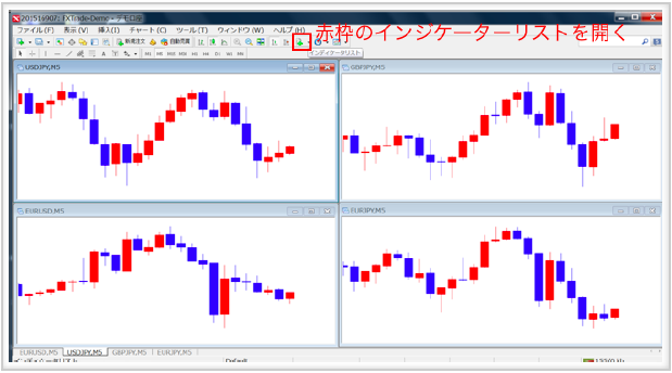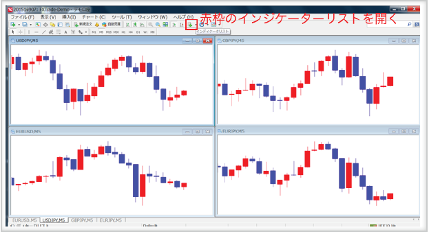 MT4を再起動しましたら、次に上記の赤枠のインジケーターリストをクリックして開きます。