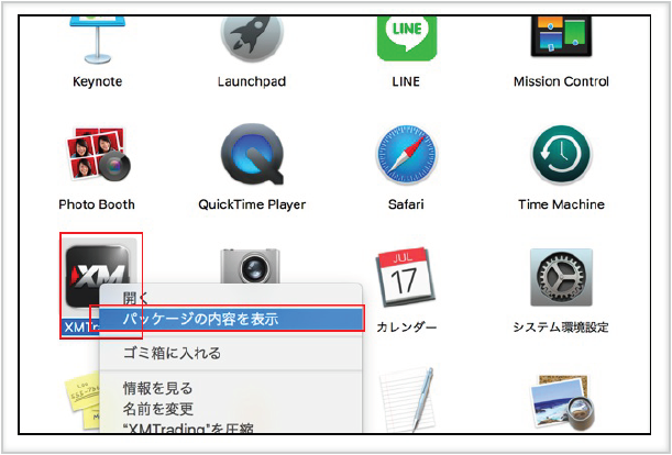 Finderの中の"XM Trading"をマウスで右クリックもしくはトラックパッドの右ボタンを二本指でクリックすると